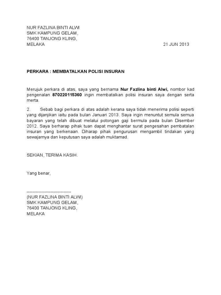CONTOH SURAT PERMOHONAN UNTUK MEMBATALKAN POLISI INSURANS PDF. PERMOHONAN MEMBATALKAN POLISI INSURANS TAKAFUL 1. Contoh surat rasmi tuntutan insurans rasmi suf.